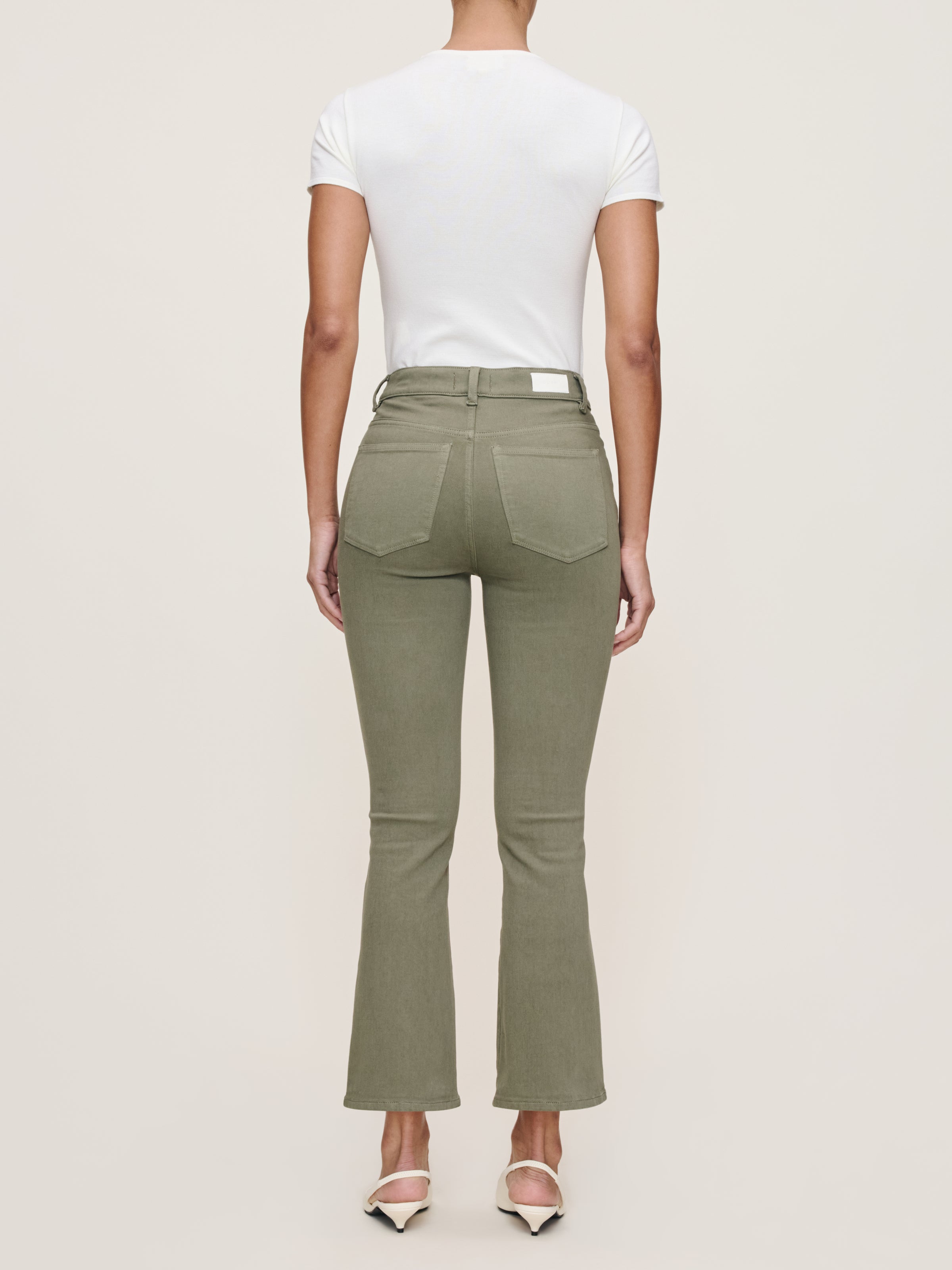 Fern is a classic, warm toned green denim. It features silver hardware, tonal stitching, a clean hem and an ecru back patch.