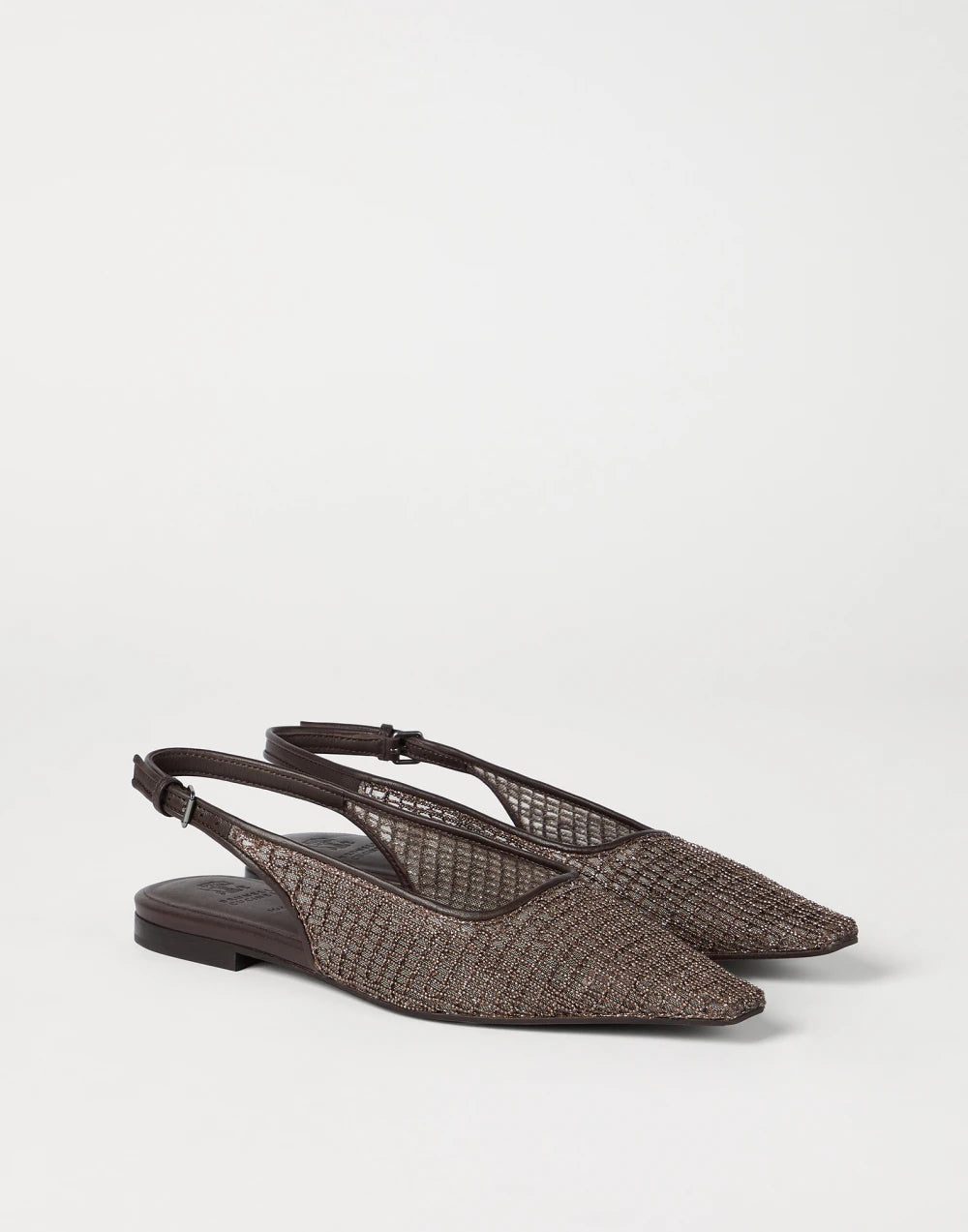 BRUNELLO CUCINELLI PRECIOUS NET EMBROIDERY SLINGBACK FLATS - BROWN ROSE GOLD